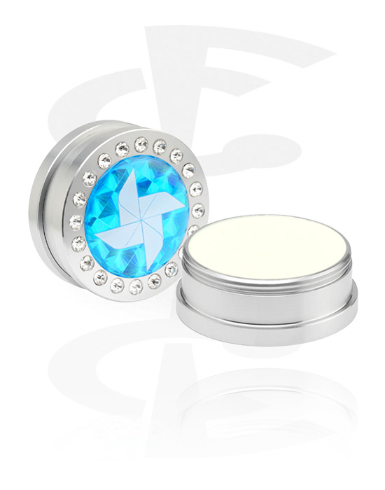 High quality jewelled container in a plug-like look, made of anodised aluminium. Available in various colours and designs. The deodorising conditioning creme takes care of your stretched earlobes and prevents bad smells. After a quick and easy application, the natural ingredients provide optimal skincare and nice smells.