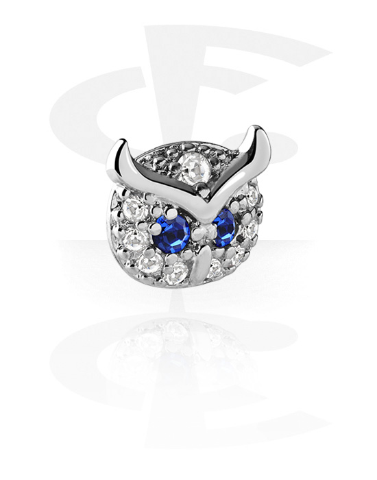 Attachment for threaded pins (plated brass, silver) with owl design and crystal stones