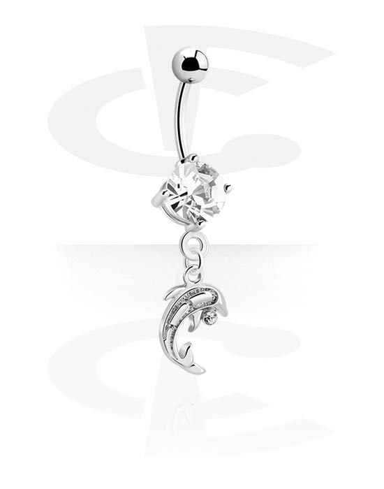 Belly button ring (surgical steel, silver, shiny finish) with dolphin charm and crystal stones