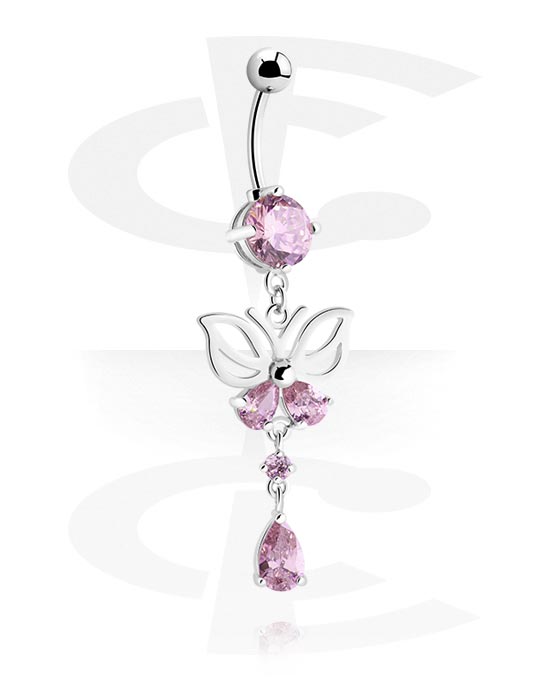 Belly button ring (surgical steel, silver, shiny finish) with butterfly charm and crystal stones