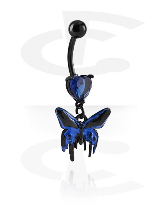 Belly button ring (surgical steel, black, shiny finish) with crystal heart and butterfly charm
