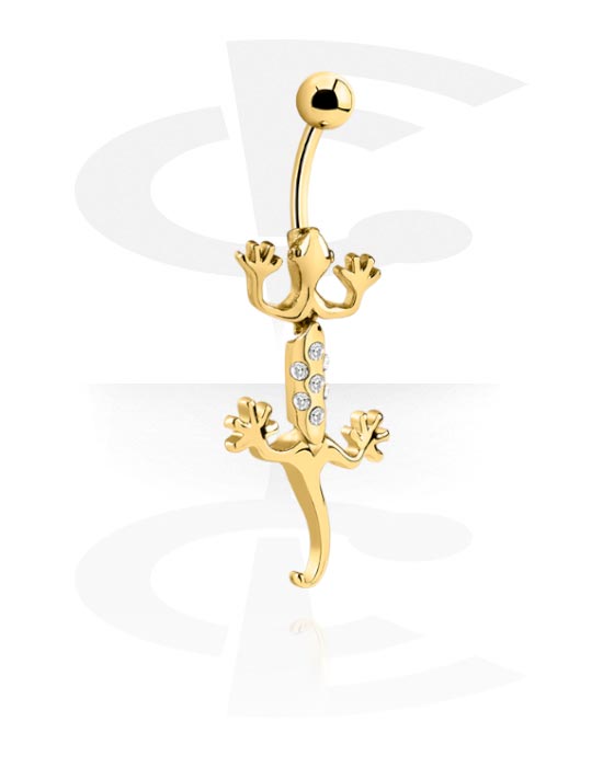 Belly button ring (surgical steel, gold, shiny finish) with gecko design and crystal stones