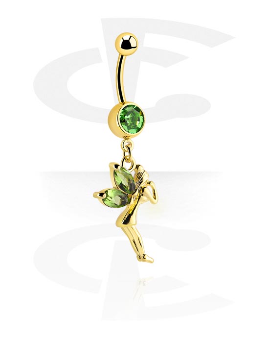 Belly button ring (surgical steel, gold, shiny finish) with fairy charm and crystal stones