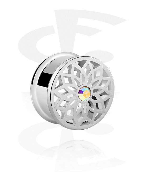 Double flared tunnel (surgical steel, silver, shiny finish) with flower design and crystal stone