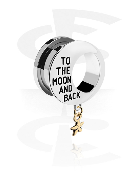 Screw-on tunnel (surgical steel, silver, shiny finish) with "To the moon and back" lettering and star charm