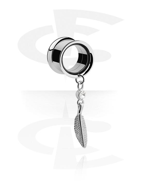 Double flared tunnel (surgical steel, silver, shiny finish) with crystal stone and feather charm