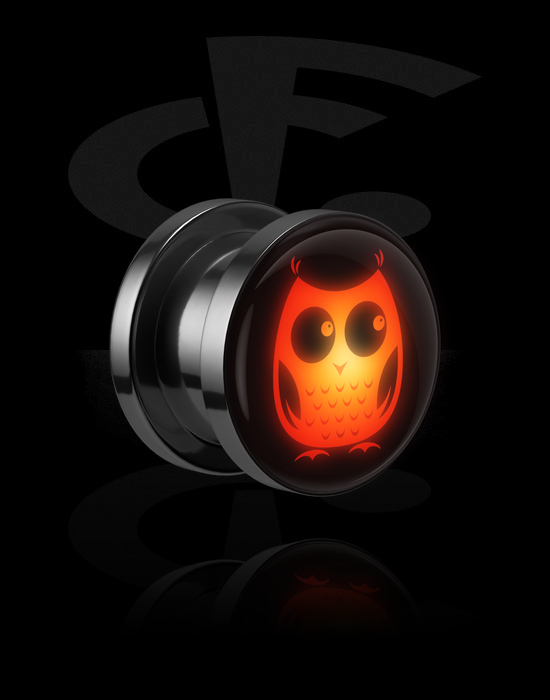Screw-on tunnel (surgical steel, silver, shiny finish) with LED attachment and owl design