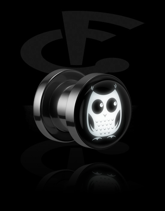 Screw-on tunnel (surgical steel, silver, shiny finish) with LED attachment and owl design