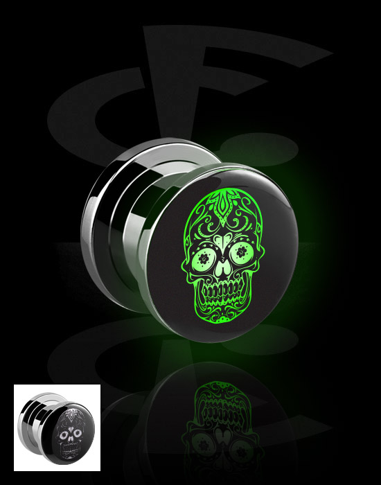 Screw-on tunnel (surgical steel, silver, shiny finish) with LED attachment and black and white sugar skull "Dia de Los Muertos" design