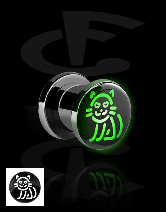 Screw-on tunnel (surgical steel, silver, shiny finish) with LED attachment and cat design