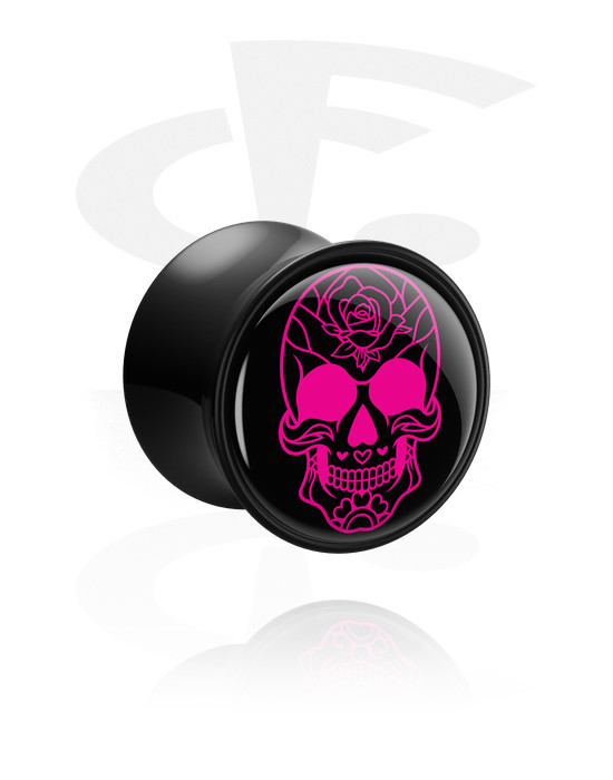 Double flared plug (acrylic, black) with sugar skull "Dia de Los Muertos" design in various colours