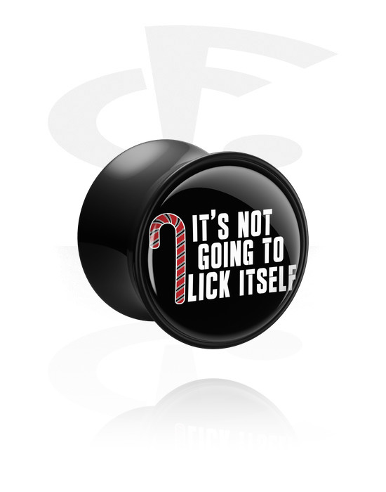 Double flared plug (acrylic, black) with "it's not going to lick itself" lettering
