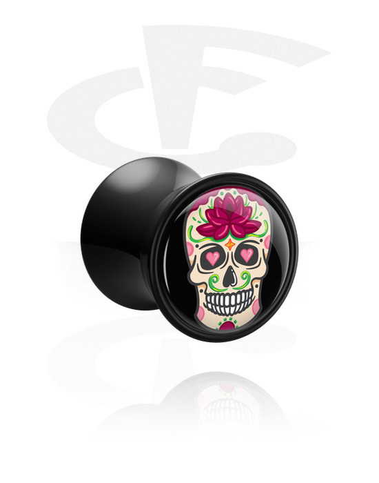 Double flared plug (acrylic, various colours) with sugar skull "Dia de Los Muertos" design