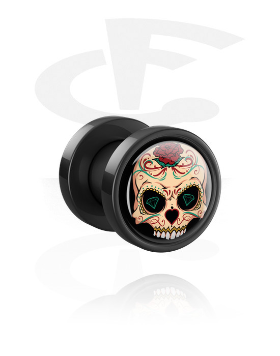 Screw-on tunnel (acrylic, black) with colourful sugar skull "Dia de Los Muertos" design