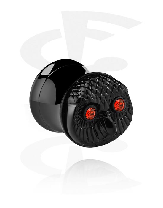 Double flared plug (surgical steel, black, shiny finish) with owl atttachment and crystal stones