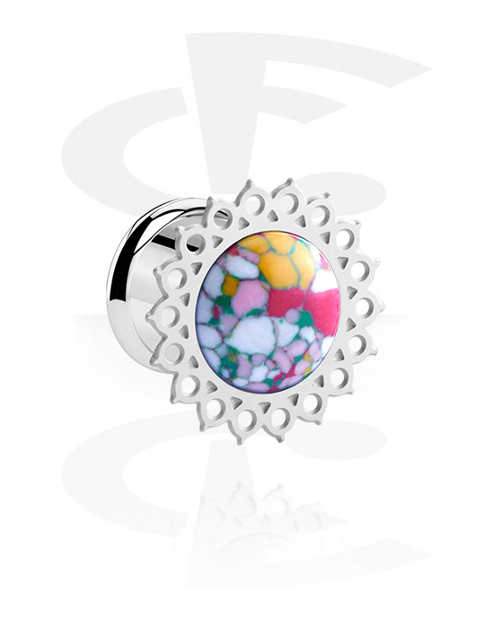 Double flared tunnel (surgical steel, silver, shiny finish) with vintage design and cap in various colours