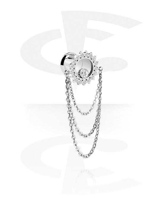 Double flared tunnel (surgical steel, silver, shiny finish) with crystal stones and chain