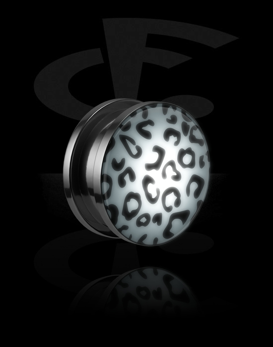 Screw-on tunnel (surgical steel, silver, shiny finish) with LED attachment and leo pattern