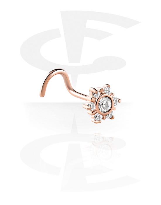 Curved nose stud (surgical steel, rose gold, shiny finish) with flower attachment and crystal stones