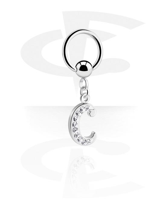 Ball closure ring (surgical steel, silver, shiny finish) with charm with letter "C" and crystal stones