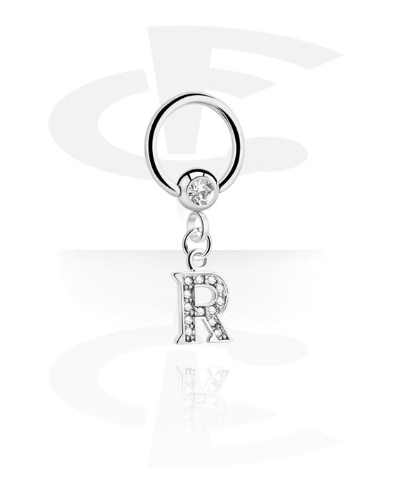 Ball closure ring (surgical steel, silver, shiny finish) with charm with letter "R" and crystal stones
