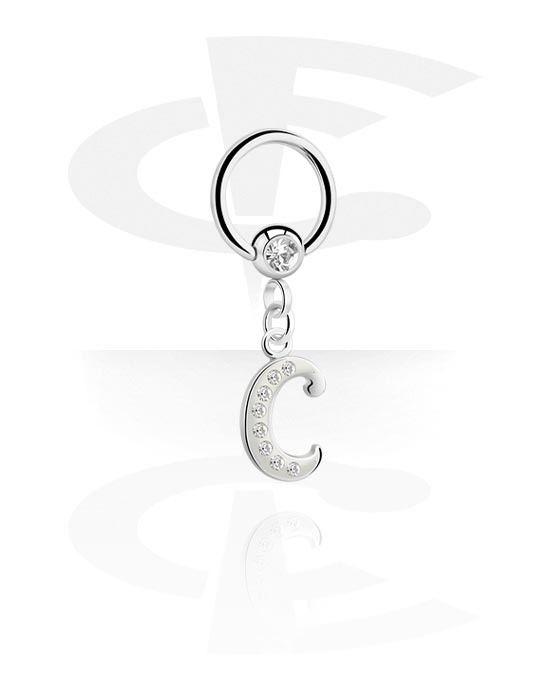 Ball closure ring (surgical steel, silver, shiny finish) with charm with letter "C" and crystal stones