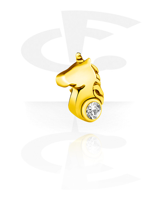 Attachment for internally threaded pins (surgical steel, gold, shiny finish) with unicorn design and crystal stone