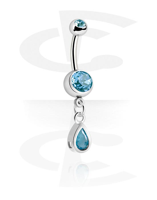 Show off your belly button piercing with this trendy curved barbell featuring two jewelled balls and a tear-shaped crystal dangle. The post and the balls made from surgical steel with plated brass dangle. A sparkling eye-catcher available in several colors.