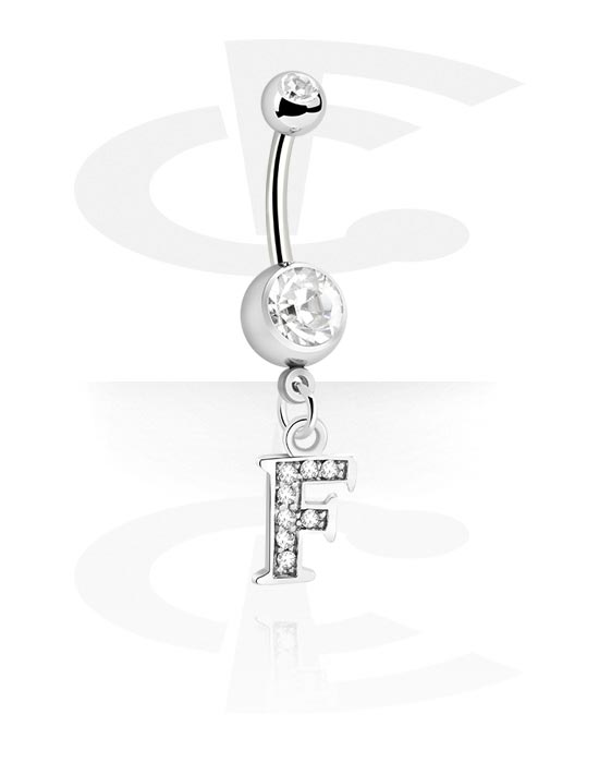 Belly button ring (surgical steel, silver, shiny finish) with charm with letter "F" and crystal stones