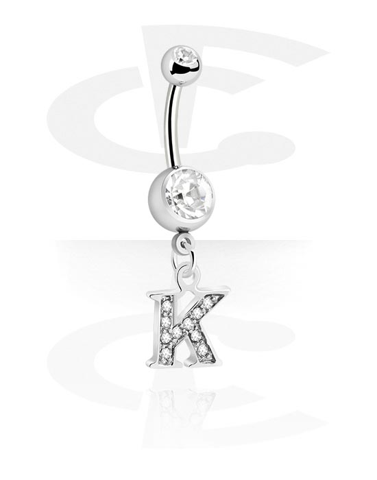 Belly button ring (surgical steel, silver, shiny finish) with charm with letter "K" and crystal stones