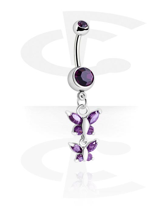 Belly button ring (surgical steel, silver, shiny finish) with butterfly charm and crystal stones