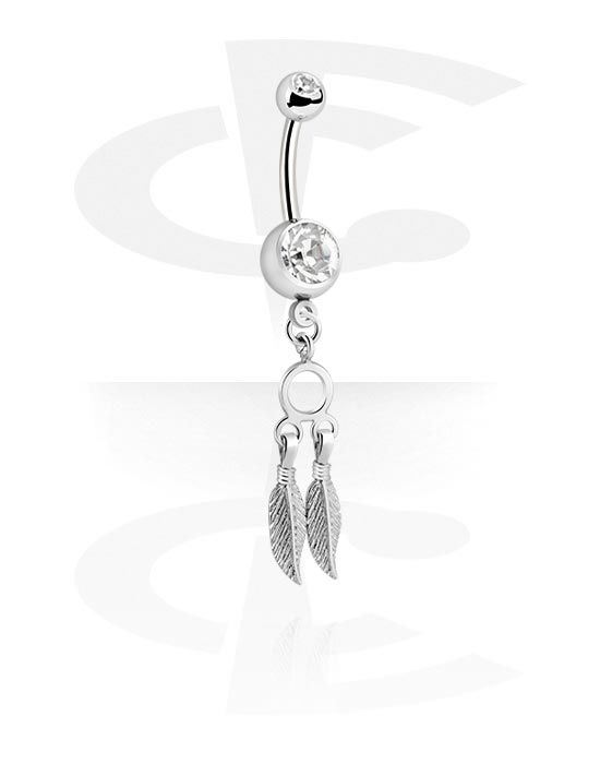 Belly button ring (surgical steel, silver, shiny finish) with feather charm and crystal stones
