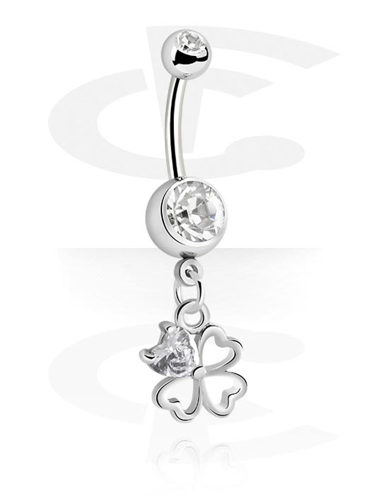 Belly button ring (surgical steel, silver, shiny finish) with cloverleaf charm and crystal stones