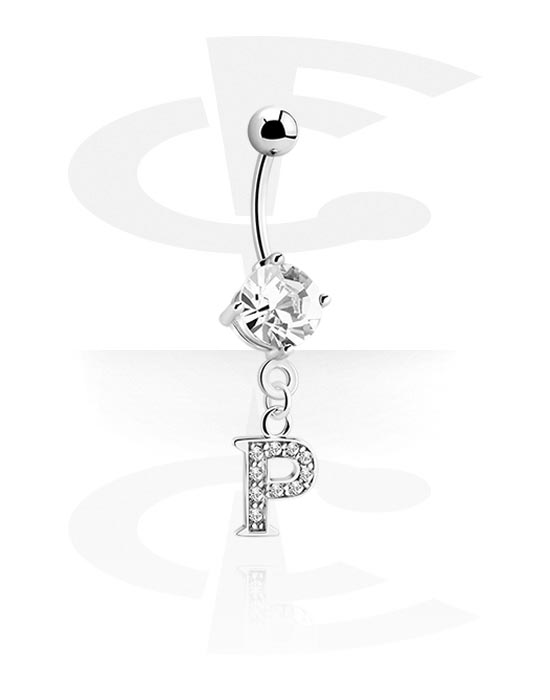 Belly button ring (surgical steel, silver, shiny finish) with charm with letter "P" and crystal stones