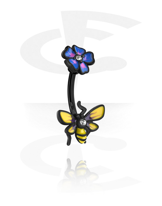 Belly button ring (surgical steel, black, shiny finish) with bee design and flower design