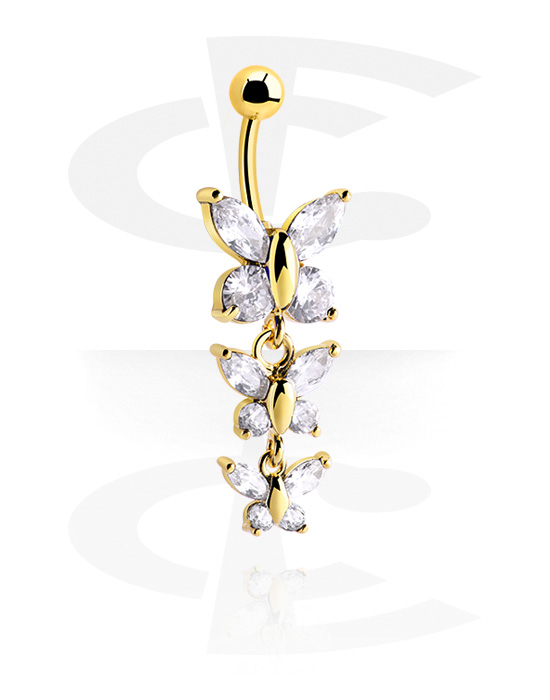 Belly button ring (surgical steel, gold, shiny finish) with butterfly design and crystal stones