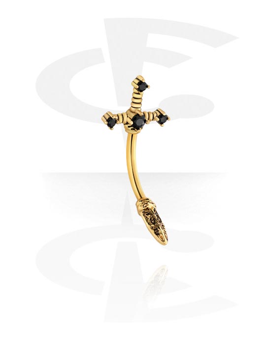 Belly button ring (surgical steel, gold, shiny finish) with sword design and crystal stones