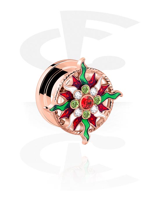 Screw-on tunnel (surgical steel, rose gold, shiny finish) with winter rose design and crystal stones