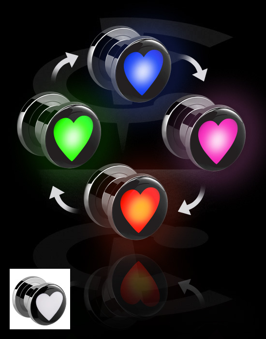 Screw-on tunnel (surgical steel, silver, shiny finish) with LED attachment and heart design