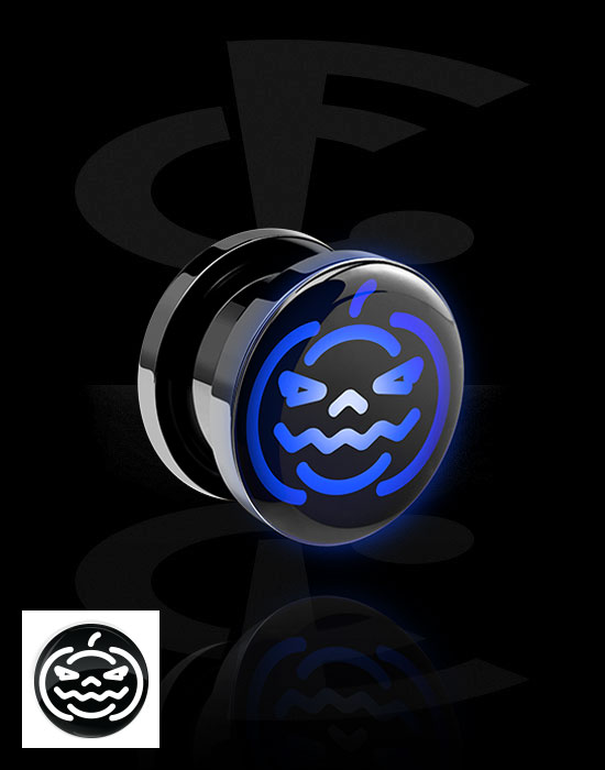 Screw-on tunnel (surgical steel, silver, shiny finish) with LED attachment and Halloween design "crazy pumpkin"