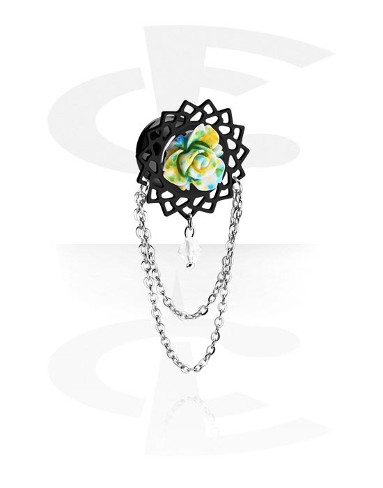 Double flared tunnel (surgical steel, black, shiny finish) with rose design and chain