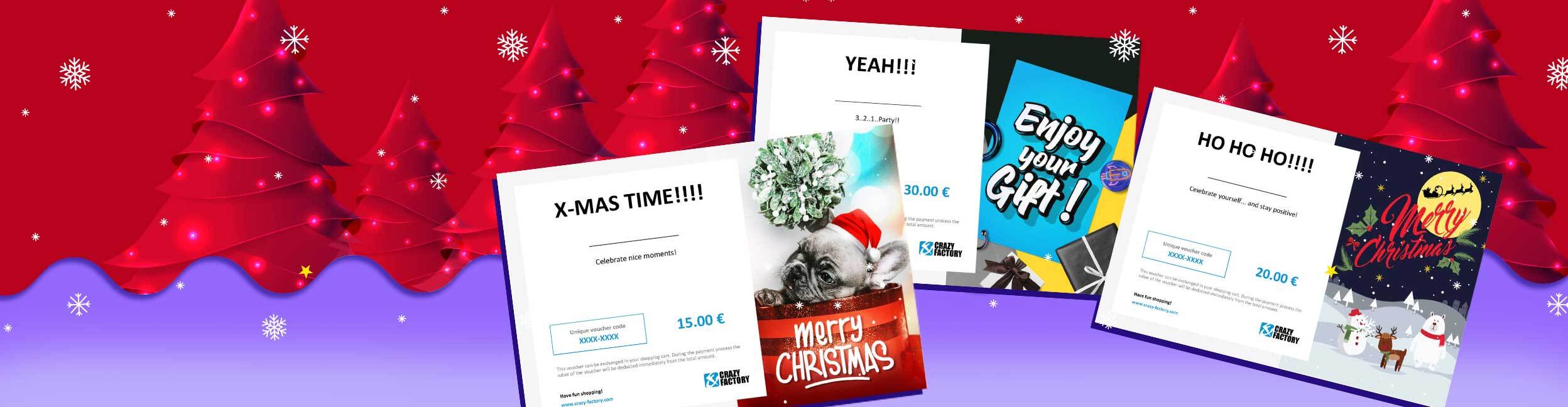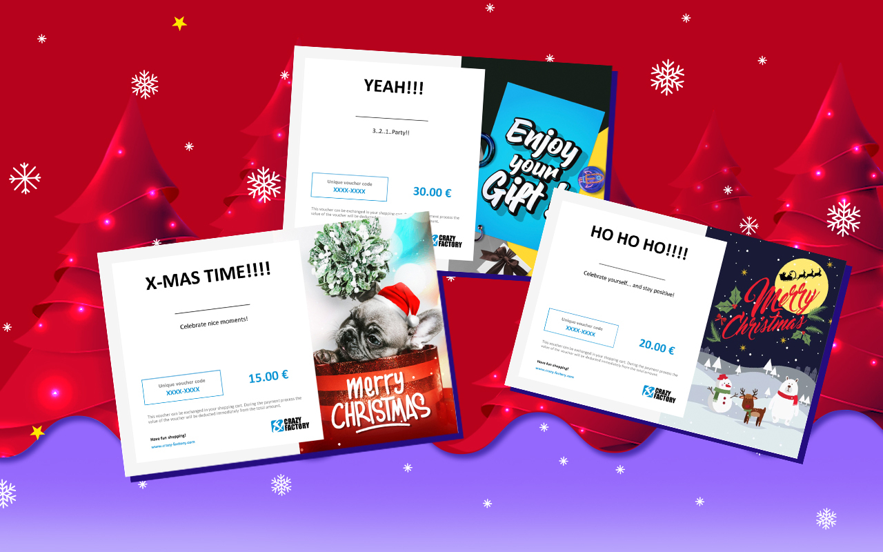 ¿No sabes qué regalar? ¿Lo mismo que el año pasado? ¿Algo práctico? Tenemos una idea mejor: ¡un cupón de Crazy Factory! Los nuevos cupones de regalo están disponibles en muchos diseños. Puedes decidir el valor del mismo y añadir un mensaje personalizado para que sea un regalo individual.