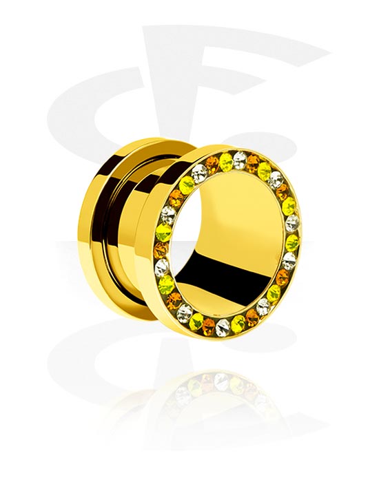 Ruuvattava tunneli (kirurginen teräs, kulta, kiiltävä pinta) kanssa kristallikivet