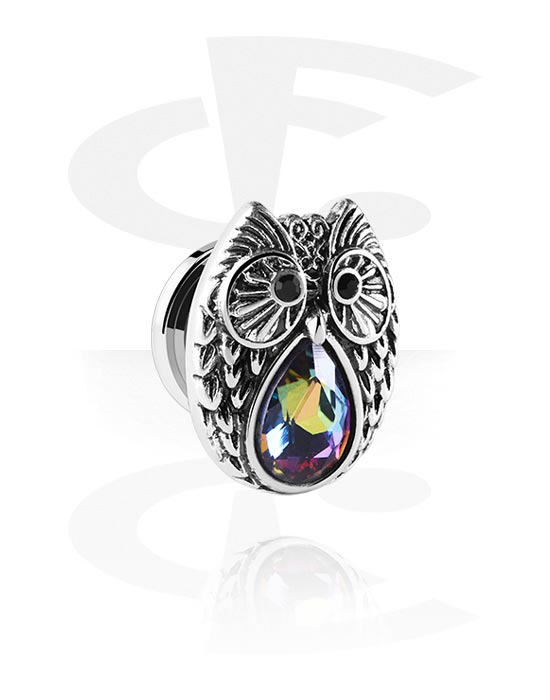 Ruuvattava tunneli (kirurginen teräs, hopea, kiiltävä pinta) kanssa pöllödesign ja kristallikivi