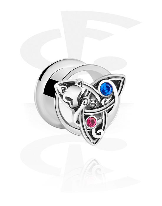 Kaksinkertainen flared-tunneli (kirurginen teräs, hopea, kiiltävä pinta) kanssa geometrinen lisäosa ja kristallikivet