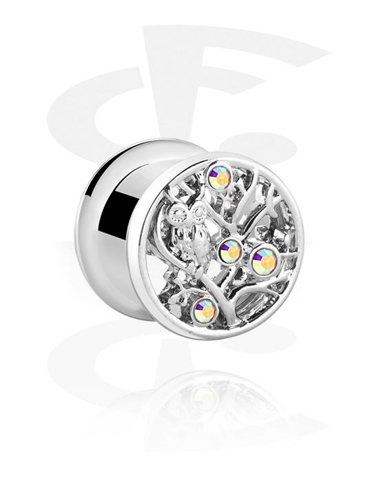 Kaksinkertainen flared-tunneli (kirurginen teräs, hopea, kiiltävä pinta) kanssa pöllödesign ja kristallikivet
