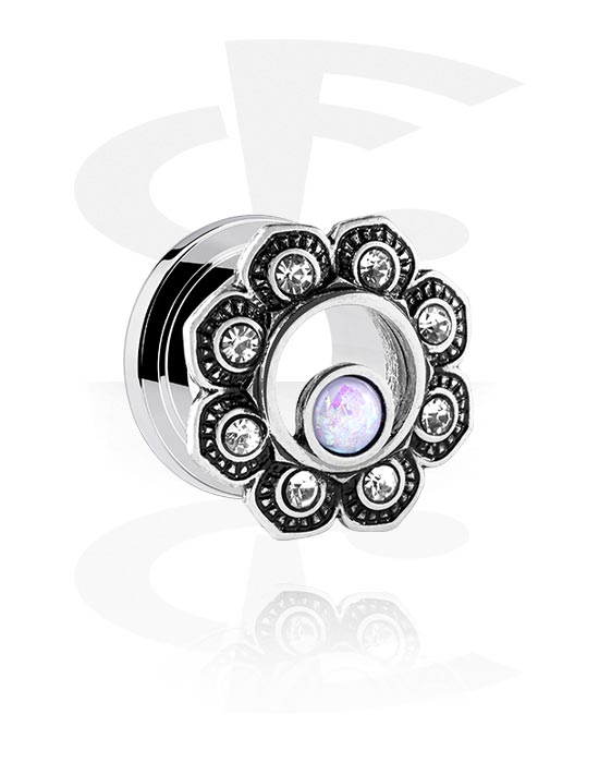 Ruuvattava tunneli (kirurginen teräs, hopea, kiiltävä pinta) kanssa kukkadesign ja kristallikivet