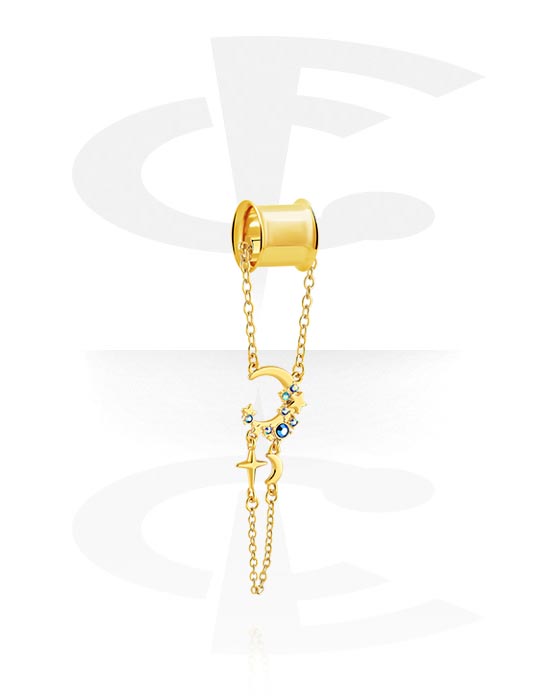 Kaksinkertainen flared-tunneli (kirurginen teräs, kulta, kiiltävä pinta) kanssa Kuunsirppidesign ja kristallikivet