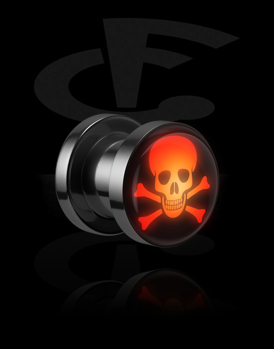 Ruuvattava tunneli (kirurginen teräs, hopea, kiiltävä pinta) kanssa LED-lisäosa ja pääkallodesign