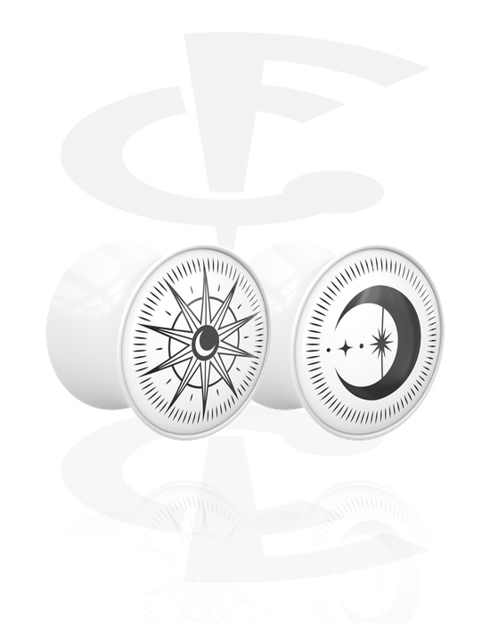 1 pari kaksinkertaisia flared-plugeja (akryyli, valkoinen) kanssa "aurinko ja kuu” -motiivi